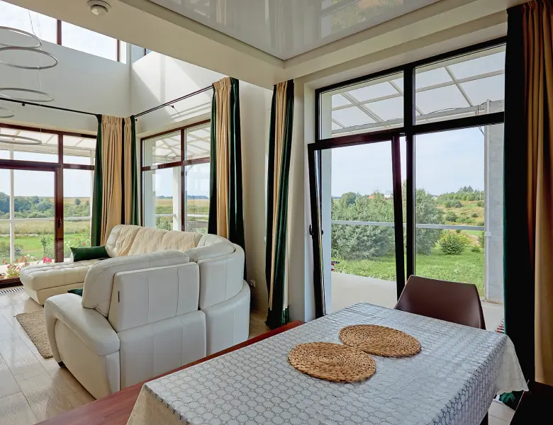 Почти незаметные в экстерьере роллеты со скрытым коробом позволяют управлять световым потоком: ночью затемняют комнаты, утром впускают в них бодрящий свет солнца. Защищают дом от шума, а остекление — от механических повреждений и осадков.