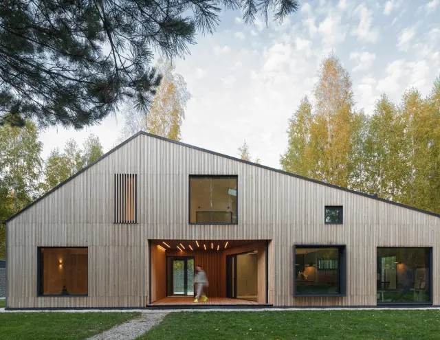 Проект каркасного дома с панорамными окнами на базе алюминиевой профильной системы ALT W72. Заказчик хотел надежные двери, поэтому мы предложили входную группу на основе системы ALT W72 D.