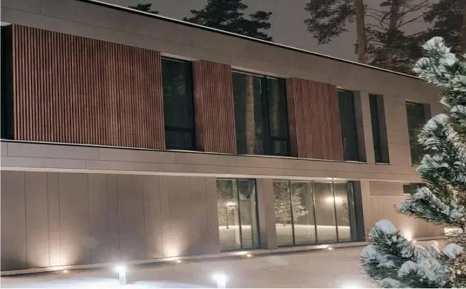 Фасадное остекление дома выглядит стильно и современно. Благодаря использованию узких профилей из алюминия оно пропускает максимум дневного света в помещения.