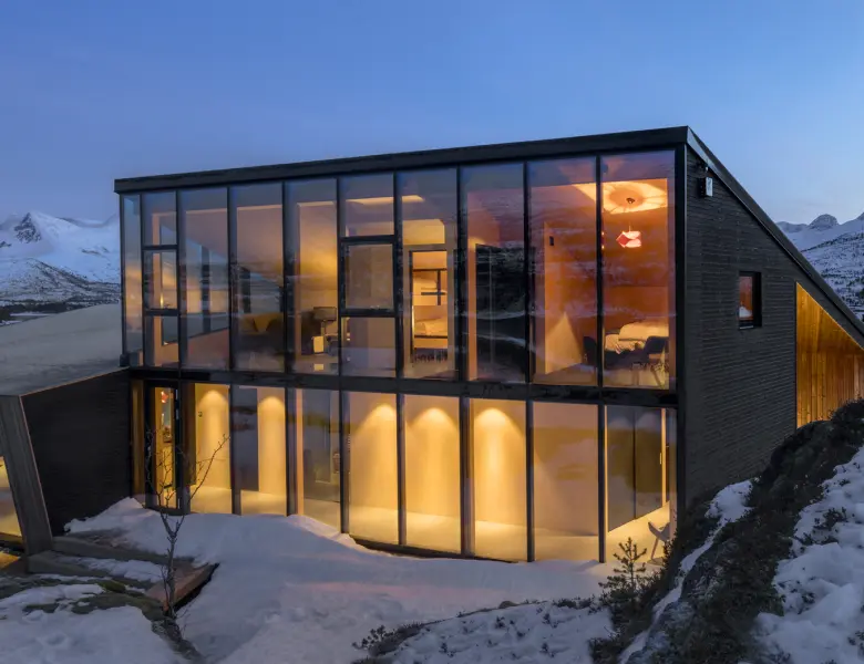 Фасадное остекление дома выглядит стильно и современно. Благодаря использованию узких профилей из алюминия оно пропускает максимум дневного света в помещения.