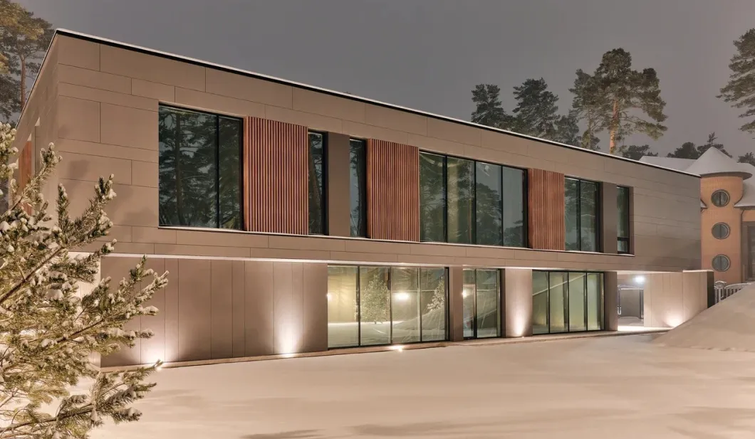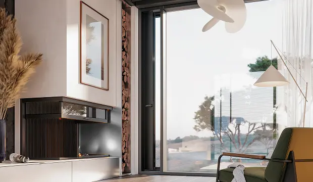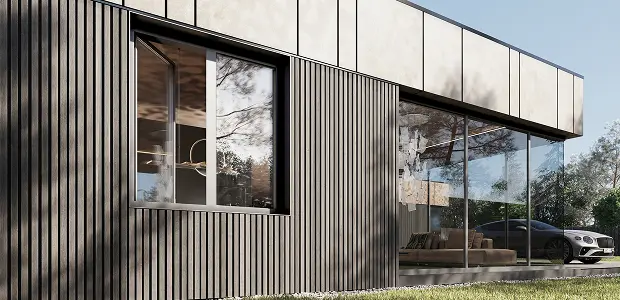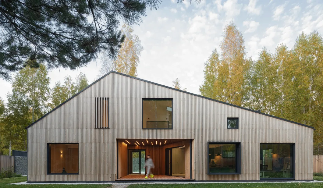 Почти незаметные в экстерьере роллеты со скрытым коробом позволяют управлять световым потоком: ночью затемняют комнаты, утром впускают в них бодрящий свет солнца. Защищают дом от шума, а остекление — от механических повреждений и осадков.