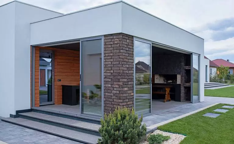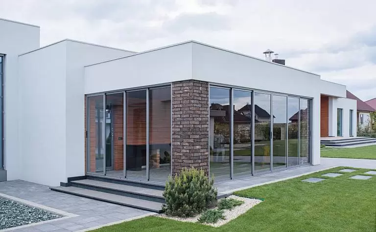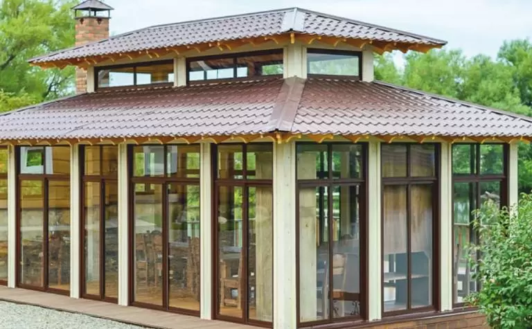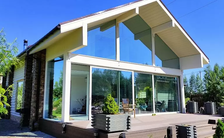 Такое решение визуально расширяет полезную площадь загородного дома. Теплое остекление веранды или террасы из алюминиевого профиля защищает от непогоды. Это позволяет организовать пространство для отдыха, пригодное для круглогодичного использования.