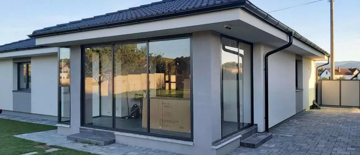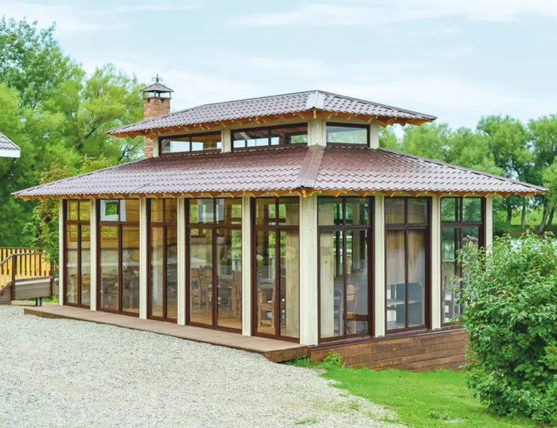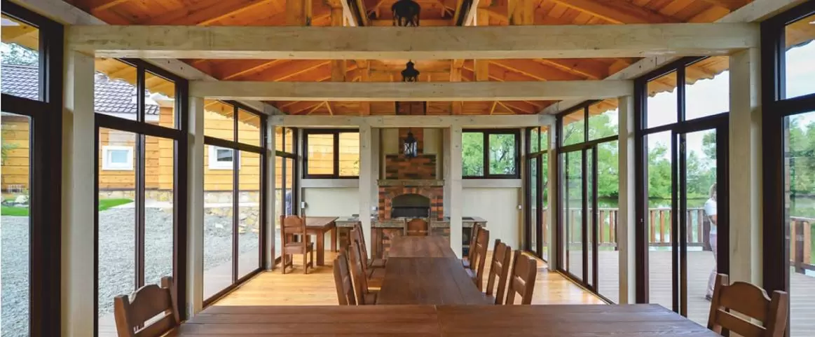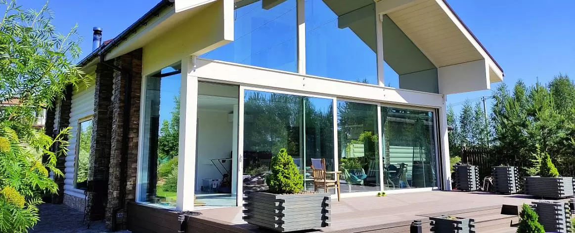 Такое решение визуально расширяет полезную площадь загородного дома. Теплое остекление веранды или террасы из алюминиевого профиля защищает от непогоды. Это позволяет организовать пространство для отдыха, пригодное для круглогодичного использования.
