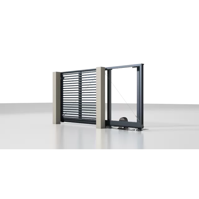 Раздвижные ворота серии Prestige Размер ворот: 6000×2000 мм Рама: 96 мм. Комбинированное заполнение: сэндвич-панель L-гофр и разреженный профиль 37 мм. цвета «Серый антрацит» (RAL 7016). Автоматика ALUTECH Roteo